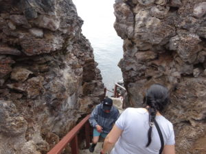 サンゴと砂浜に上陸し、潮だまりのラグーンや断崖を望む道を歩きます。